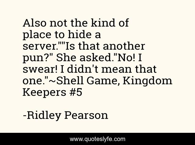 This page presents the quote "Also not the kind of place to hide a server.""Is that another pun?" She asked."No! I swear! I didn't mean that one."~Shell Game, Kingdom Keepers #5". Author of this quote is Ridley Pearson. This quote is about humor, bad, puns,.