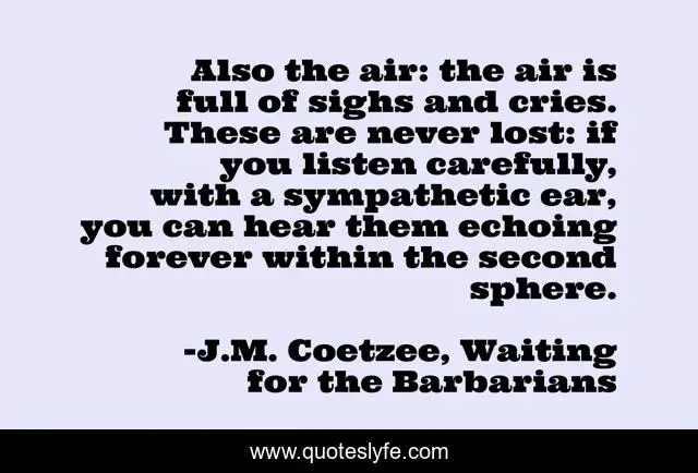 This page presents the quote "Also the air: the air is full of sighs and cries. These are never lost: if you listen carefully, with a sympathetic ear, you can hear them echoing forever within the second sphere.". Author of this quote is J.M. Coetzee, Waiting for the Barbarians. This quote is about past, memories, listening,.