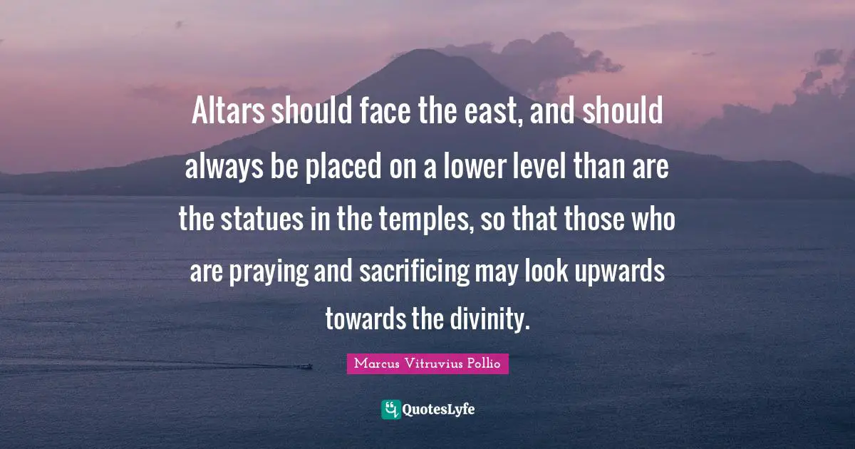 This page presents the quote "Altars should face the east, and should always be placed on a lower level than are the statues in the temples, so that those who are praying and sacrificing may look upwards towards the divinity.". Author of this quote is Marcus Vitruvius Pollio. This quote is about may, statues, divinity, temples, looks, sacrifice, east, altars, praying,.
