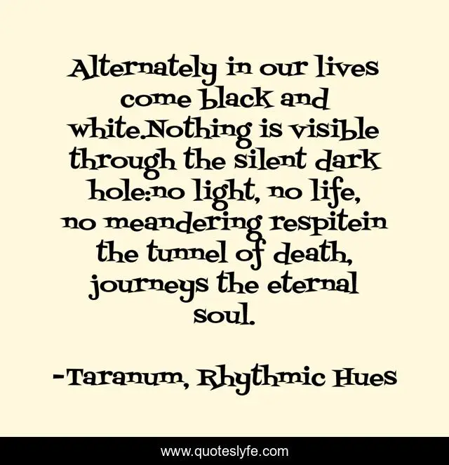 This page presents the quote "Alternately in our lives come black and white.Nothing is visible through the silent dark hole:no light, no life, no meandering respitein the tunnel of death, journeys the eternal soul.". Author of this quote is Taranum, Rhythmic Hues. .