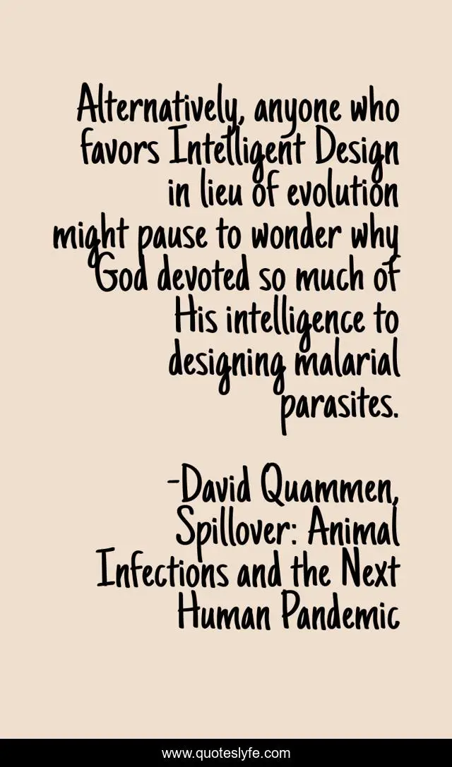 This page presents the quote "Alternatively, anyone who favors Intelligent Design in lieu of evolution might pause to wonder why God devoted so much of His intelligence to designing malarial parasites.". Author of this quote is David Quammen, Spillover: Animal Infections and the Next Human Pandemic. This quote is about science, evolution, humor,.