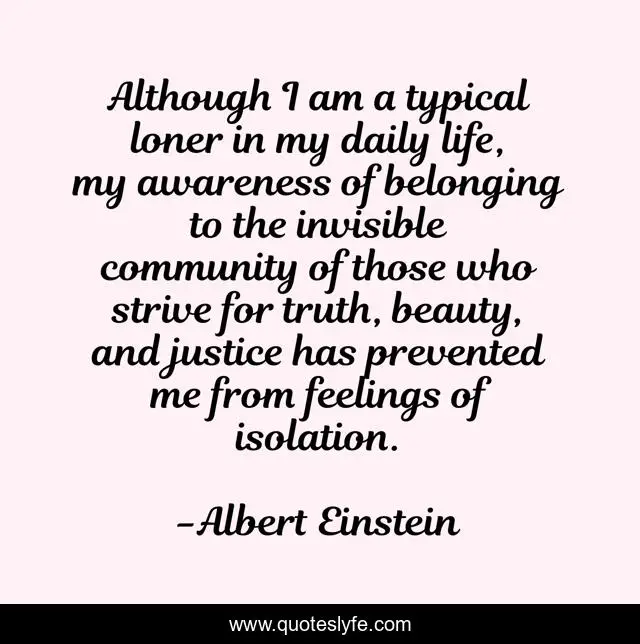 This page presents the quote "Although I am a typical loner in my daily life, my awareness of belonging to the invisible community of those who strive for truth, beauty, and justice has prevented me from feelings of isolation.". Author of this quote is Albert Einstein. This quote is about enthusiasm, einstein, albert-einstein, inspirational, loner,.