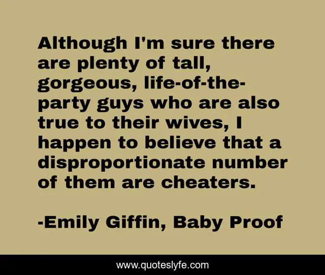 This page presents the quote "Although I'm sure there are plenty of tall, gorgeous, life-of-the-party guys who are also true to their wives, I happen to believe that a disproportionate number of them are cheaters.". Author of this quote is Emily Giffin, Baby Proof. This quote is about cheater, men,.