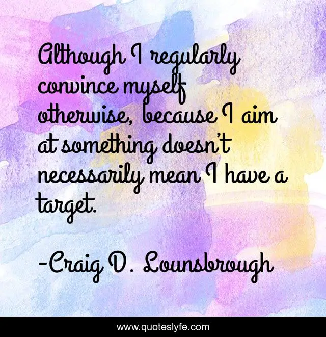 This page presents the quote "Although I regularly convince myself otherwise, because I aim at something doesn’t necessarily mean I have a target.". Author of this quote is Craig D. Lounsbrough. This quote is about targeting, target, objectives, bulls-eye, convincing, mission, calling, aim, convince,.