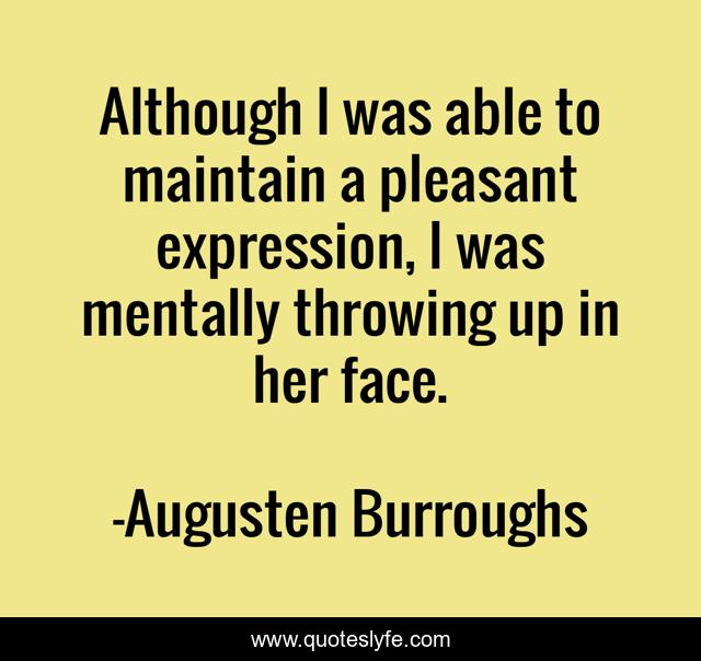 This page presents the quote "Although I was able to maintain a pleasant expression, I was mentally throwing up in her face.". Author of this quote is Augusten Burroughs. This quote is about confessions, humor, magical-thinking,.
