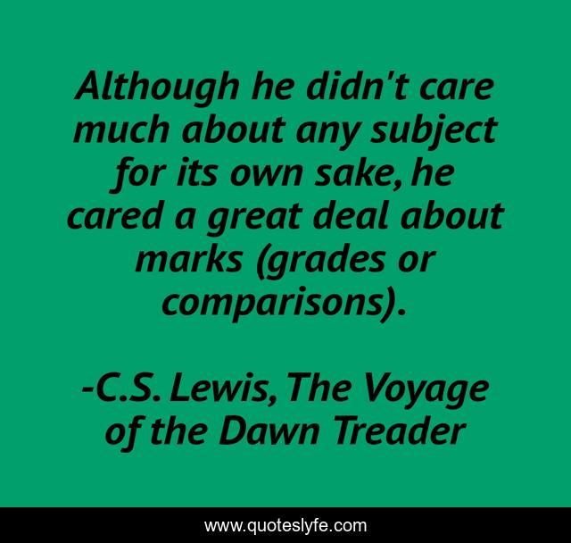 This page presents the quote "Although he didn't care much about any subject for its own sake, he cared a great deal about marks (grades or comparisons).". Author of this quote is C.S. Lewis, The Voyage of the Dawn Treader. This quote is about comparisons, pride, legalism, curiosity,.
