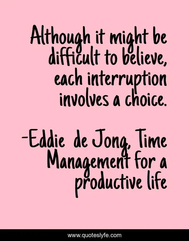 This page presents the quote "Although it might be difficult to believe, each interruption involves a choice.". Author of this quote is Eddie de Jong, Time Management for a productive life. .