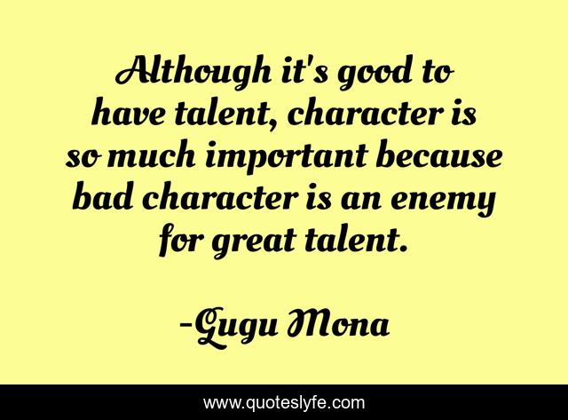 This page presents the quote "Although it's good to have talent, character is so much important because bad character is an enemy for great talent.". Author of this quote is Gugu Mona. This quote is about enemy, good, character, talent, great-talent,.