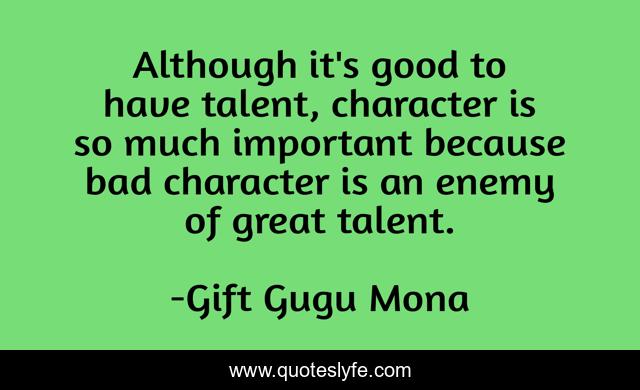 This page presents the quote "Although it's good to have talent, character is so much important because bad character is an enemy of great talent.". Author of this quote is Gift Gugu Mona. This quote is about bad-character, good, talent, life-balance, great-talent,.