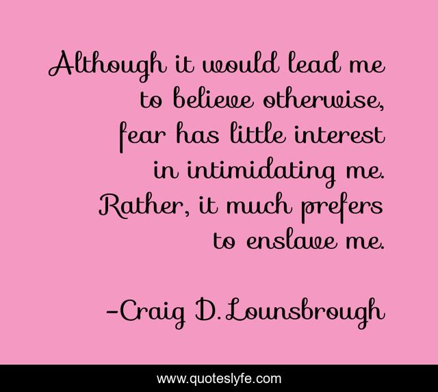 This page presents the quote "Although it would lead me to believe otherwise, fear has little interest in intimidating me. Rather, it much prefers to enslave me.". Author of this quote is Craig D. Lounsbrough. This quote is about slave, fearing, fearful, freedom, slavery, intimidation, intimidate, enslavement, fear,.