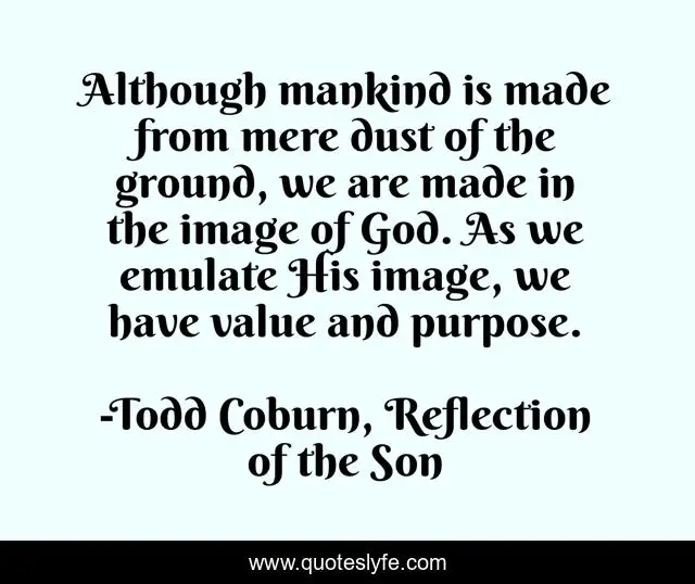 This page presents the quote "Although mankind is made from mere dust of the ground, we are made in the image of God. As we emulate His image, we have value and purpose.". Author of this quote is Todd Coburn, Reflection of the Son. This quote is about god, purpose, value, man,.