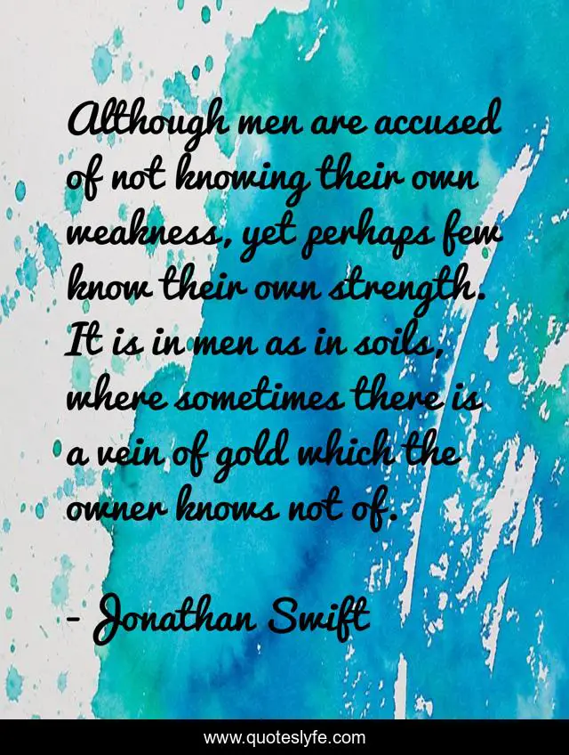 This page presents the quote "Although men are accused of not knowing their own weakness, yet perhaps few know their own strength. It is in men as in soils, where sometimes there is a vein of gold which the owner knows not of.". Author of this quote is Jonathan Swift. This quote is about weakness, men, gold,.