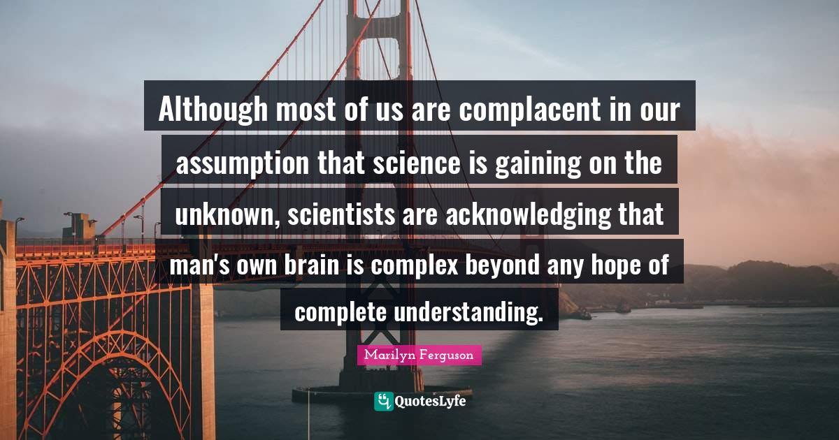 This page presents the quote "Although most of us are complacent in our assumption that science is gaining on the unknown, scientists are acknowledging that man's own brain is complex beyond any hope of complete understanding.". Author of this quote is Marilyn Ferguson. This quote is about assumption, men, complacent, brain, hope, understanding, science,.