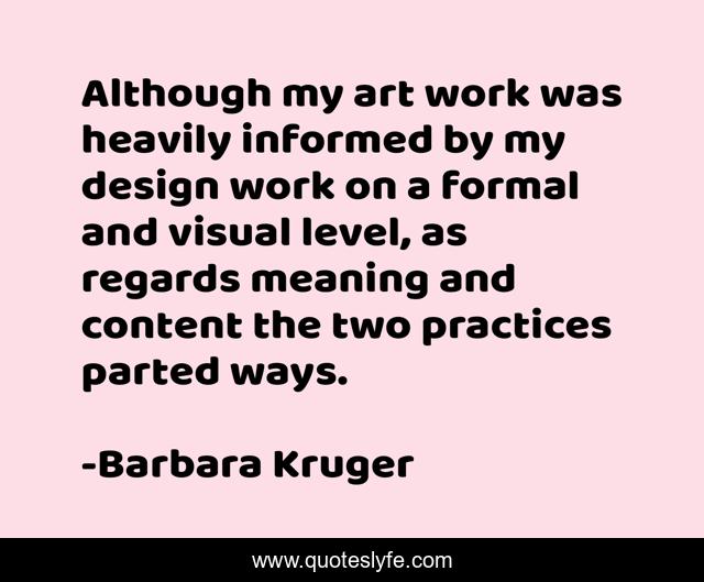 This page presents the quote "Although my art work was heavily informed by my design work on a formal and visual level, as regards meaning and content the two practices parted ways.". Author of this quote is Barbara Kruger. This quote is about meaning, work, art,.