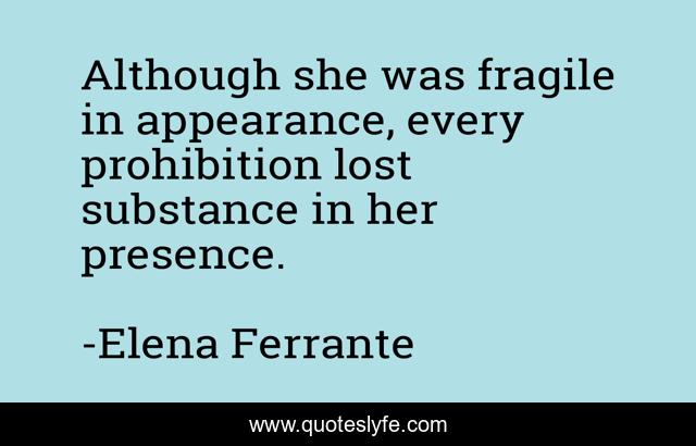 This page presents the quote "Although she was fragile in appearance, every prohibition lost substance in her presence.". Author of this quote is Elena Ferrante. This quote is about fragile, determination, composure,.