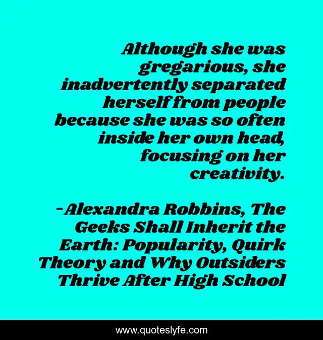 This page presents the quote "Although she was gregarious, she inadvertently separated herself from people because she was so often inside her own head, focusing on her creativity.". Author of this quote is Alexandra Robbins, The Geeks Shall Inherit the Earth: Popularity, Quirk Theory and Why Outsiders Thrive After High School. This quote is about imagination, introversion,.