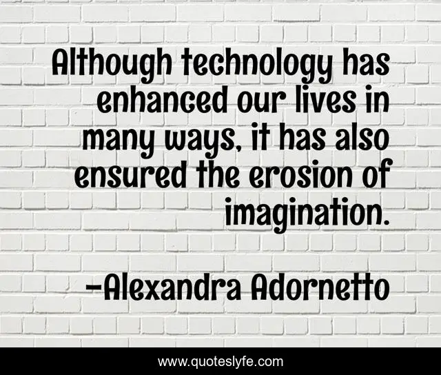 This page presents the quote "Although technology has enhanced our lives in many ways, it has also ensured the erosion of imagination.". Author of this quote is Alexandra Adornetto. This quote is about our lives, technology,.