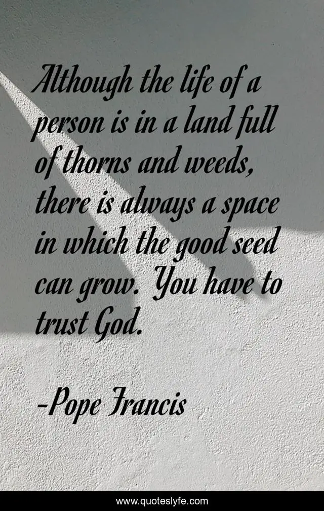 This page presents the quote "Although the life of a person is in a land full of thorns and weeds, there is always a space in which the good seed can grow. You have to trust God.". Author of this quote is Pope Francis. This quote is about life, trust, good,.