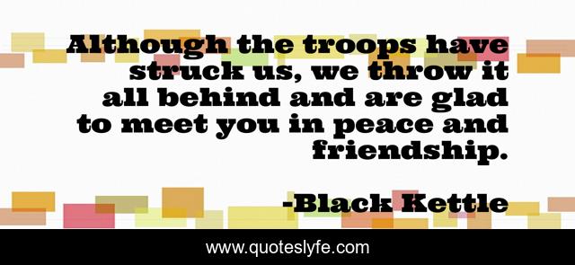 This page presents the quote "Although the troops have struck us, we throw it all behind and are glad to meet you in peace and friendship.". Author of this quote is Black Kettle. This quote is about behind, peace,.