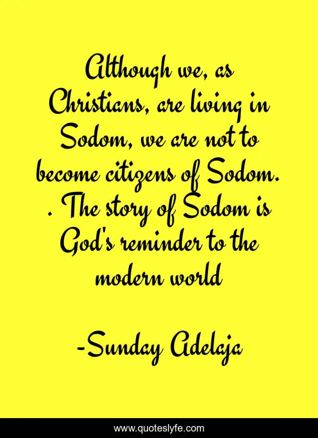 This page presents the quote "Although we, as Christians, are living in Sodom, we are not to become citizens of Sodom. . The story of Sodom is God's reminder to the modern world". Author of this quote is Sunday Adelaja. This quote is about living, story, god, modernity, citizens, although, become, reminder, christians,.