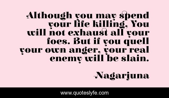 This page presents the quote "Although you may spend your life killing, You will not exhaust all your foes. But if you quell your own anger, your real enemy will be slain.". Author of this quote is Nagarjuna. This quote is about enemy, life,.