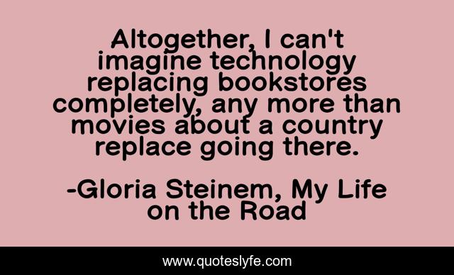 This page presents the quote "Altogether, I can't imagine technology replacing bookstores completely, any more than movies about a country replace going there.". Author of this quote is Gloria Steinem, My Life on the Road. This quote is about travel, technology, bookstores,.