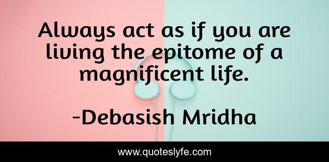 This page presents the quote "Always act as if you are living the epitome of a magnificent life.". Author of this quote is Debasish Mridha. This quote is about life, epitome-of-life, philosophy, debasish-mridha, living-a-magnificent-life, quotes, debasish-mridha-md, inspirational, enthusiasm,.
