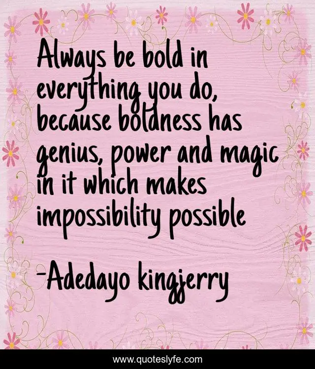 This page presents the quote "Always be bold in everything you do, because boldness has genius, power and magic in it which makes impossibility possible". Author of this quote is Adedayo kingjerry. This quote is about enthusiasm, courage, inspirational,.