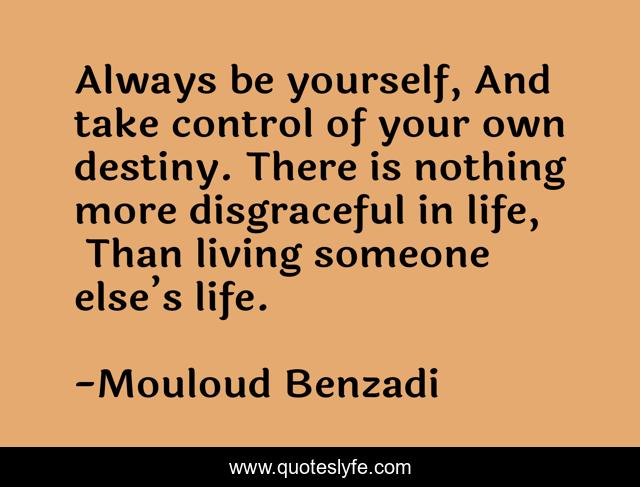This page presents the quote "Always be yourself, And take control of your own destiny. There is nothing more disgraceful in life, Than living someone else’s life.". Author of this quote is Mouloud Benzadi. This quote is about be-yourself, destiny, be_yourself,.
