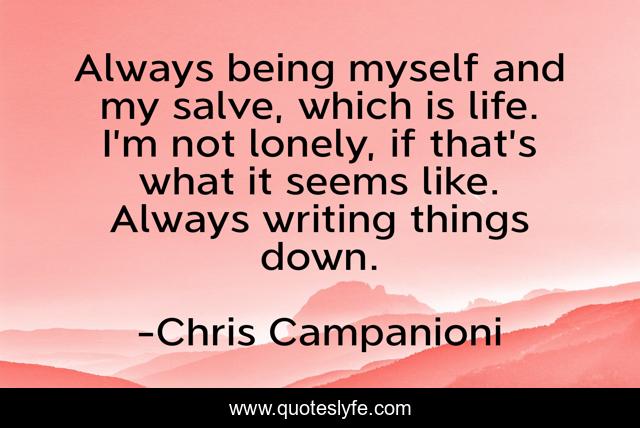 This page presents the quote "Always being myself and my salve, which is life. I’m not lonely, if that’s what it seems like. Always writing things down.". Author of this quote is Chris Campanioni. This quote is about writing-life, writing-process, metaphysical, inspirational, artistic-expression, inspirational-life, enthusiasm, metafiction, writers-on-writing,.