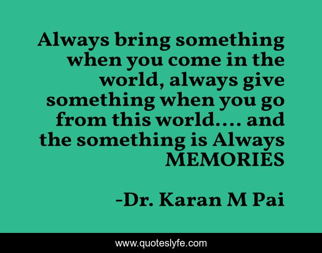 This page presents the quote "Always bring something when you come in the world, always give something when you go from this world.... and the something is Always MEMORIES". Author of this quote is Dr. Karan M Pai. This quote is about life-and-living, pleasures-of-life,.