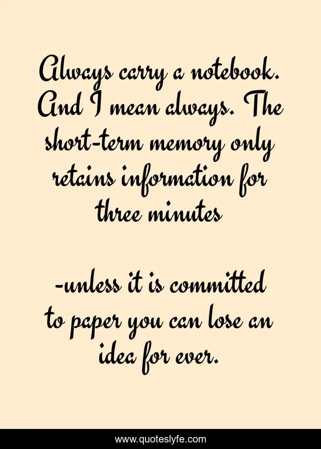 This page presents the quote "Always carry a notebook. And I mean always. The short-term memory only retains information for three minutes". Author of this quote is unless it is committed to paper you can lose an idea for ever.. .