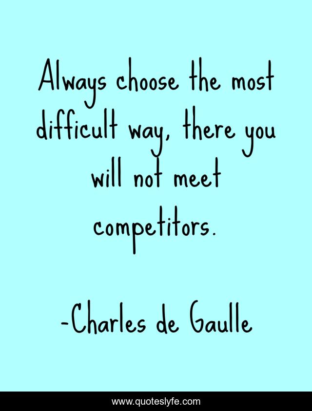 This page presents the quote "Always choose the most difficult way, there you will not meet competitors.". Author of this quote is Charles de Gaulle. This quote is about life-philosophy, education, professionalism,.