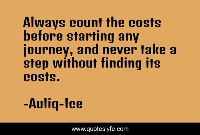 This page presents the quote "Always count the costs before starting any journey, and never take a step without finding its costs.". Author of this quote is Auliq-Ice. This quote is about confidence, life, accountability, courage, responsibility, risks, caution,.