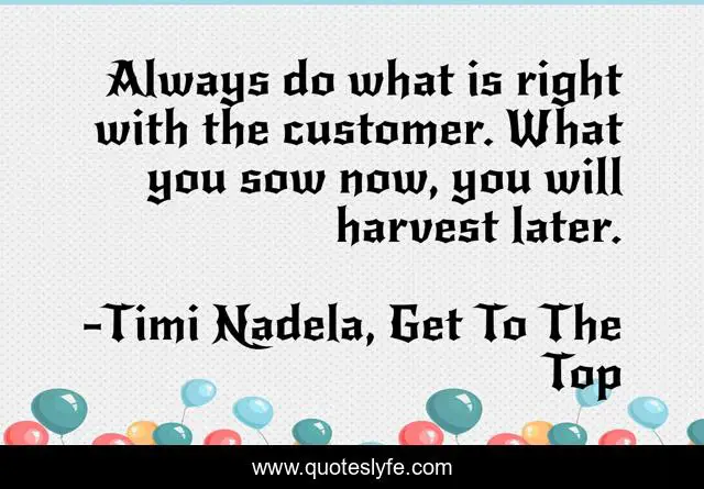 This page presents the quote "Always do what is right with the customer. What you sow now, you will harvest later.". Author of this quote is Timi Nadela, Get To The Top. This quote is about small-business, sales, salestips,.