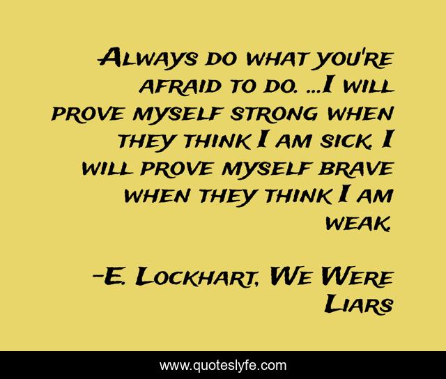 This page presents the quote "Always do what you're afraid to do. ...I will prove myself strong when they think I am sick. I will prove myself brave when they think I am weak.". Author of this quote is E. Lockhart, We Were Liars. This quote is about afraid, liars, we-were-liars, mottos, prove, weak, brave, sick, e-lockhart,.
