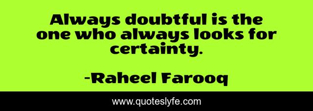 This page presents the quote "Always doubtful is the one who always looks for certainty.". Author of this quote is Raheel Farooq. This quote is about certainty, doubtfulness, doubt, suspicion, life-lessons, suspense, skepticism,.