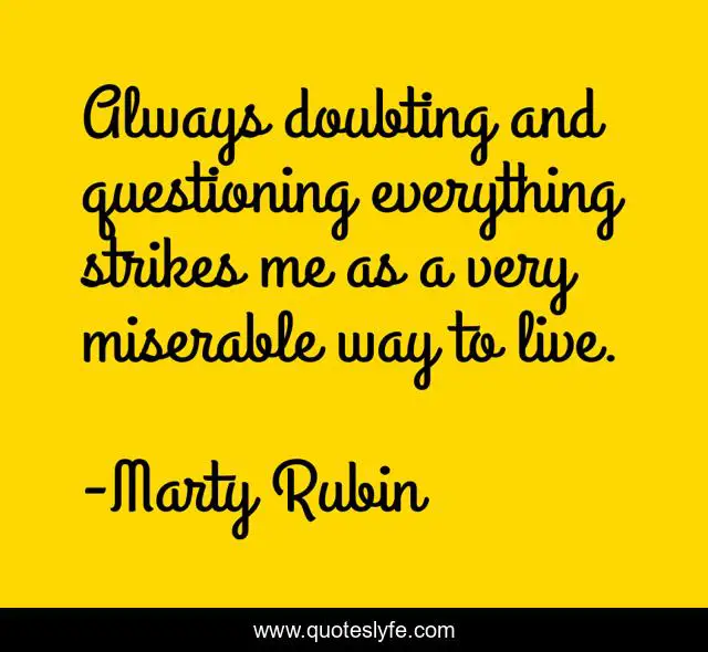 This page presents the quote "Always doubting and questioning everything strikes me as a very miserable way to live.". Author of this quote is Marty Rubin. This quote is about doubting, misery, a-miserable-life, questioning,.