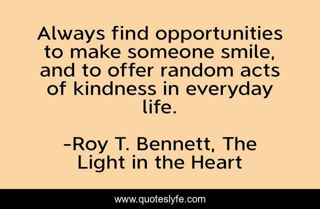 This page presents the quote "Always find opportunities to make someone smile, and to offer random acts of kindness in everyday life.". Author of this quote is Roy T. Bennett, The Light in the Heart. This quote is about inspire, acts-of-kindness, optimistic, inspirational-life, life-and-living, happiness, living, inspiring, positive,.