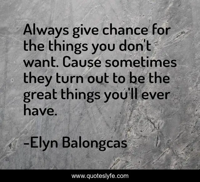 This page presents the quote "Always give chance for the things you don't want. Cause sometimes they turn out to be the great things you'll ever have.". Author of this quote is Elyn Balongcas. This quote is about positive-attitude, chance, positive-mindset, positive-thinking,.