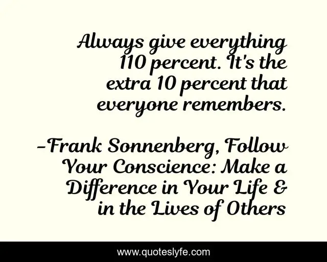 "Frank Sonnenberg, Follow Your Conscience: Make a Difference in Your Life & in the Lives of Others Quotes." Quoteslyfe.com, 2025. Fri. 05 Dec. 2025. <https://www.quoteslyfe.com/quote/Always-give-everything-110-percent-It-s-186324>.