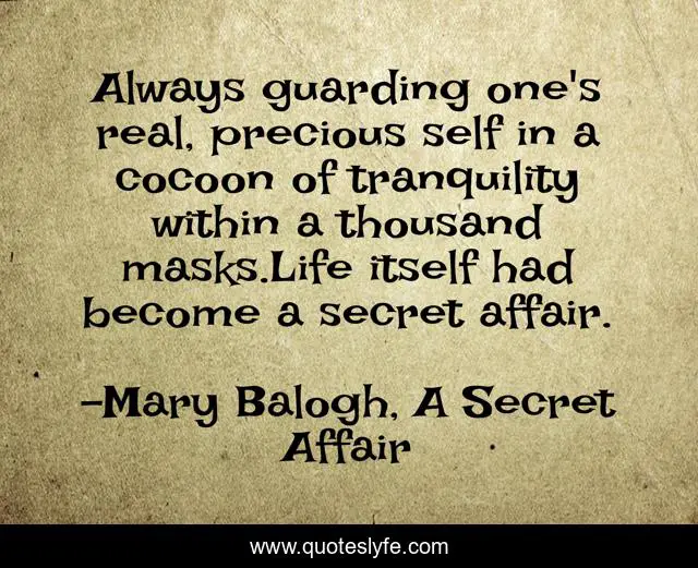 This page presents the quote "Always guarding one's real, precious self in a cocoon of tranquility within a thousand masks.Life itself had become a secret affair.". Author of this quote is Mary Balogh, A Secret Affair. This quote is about affair, life, mask, secret,.