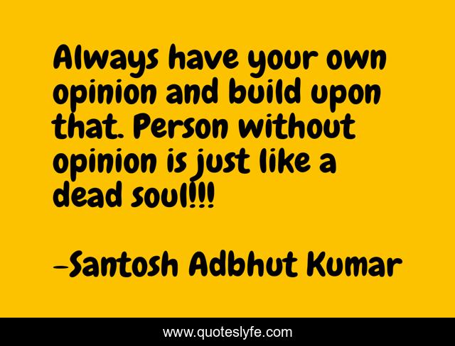 This page presents the quote "Always have your own opinion and build upon that. Person without opinion is just like a dead soul!!!". Author of this quote is Santosh Adbhut Kumar. This quote is about opinion, adbhut, soul, dead,.