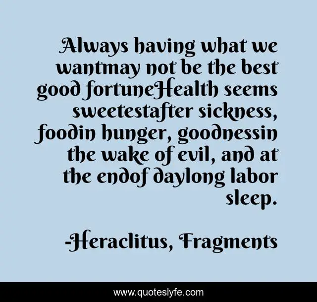 This page presents the quote "Always having what we wantmay not be the best good fortuneHealth seems sweetestafter sickness, foodin hunger, goodnessin the wake of evil, and at the endof daylong labor sleep.". Author of this quote is Heraclitus, Fragments. This quote is about unfulfillment, fulfillment, goals, dreams, desires,.