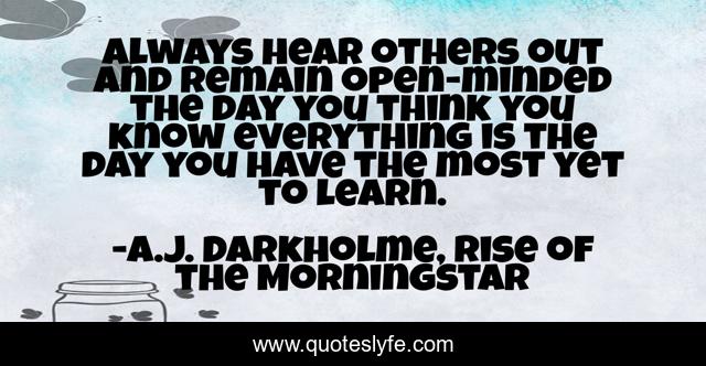 This page presents the quote "Always hear others out and remain open-minded the day you think you know everything is the day you have the most yet to learn.". Author of this quote is A.J. Darkholme, Rise of the Morningstar. This quote is about knowledge, people, leading, ignorance, open-mindedness, open-minded, leadership, hear, learning,.