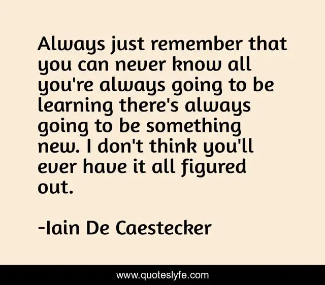 This page presents the quote "Always just remember that you can never know all you're always going to be learning there's always going to be something new. I don't think you'll ever have it all figured out.". Author of this quote is Iain De Caestecker. This quote is about think, remember,.