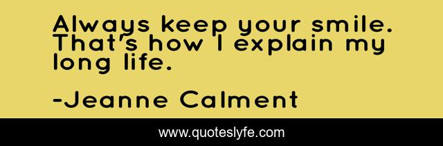 This page presents the quote "Always keep your smile. That's how I explain my long life.". Author of this quote is Jeanne Calment. This quote is about smile, life, happiness,.
