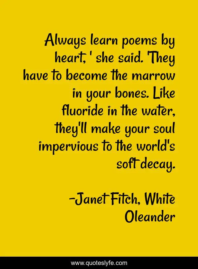 This page presents the quote "Always learn poems by heart, ' she said. 'They have to become the marrow in your bones. Like fluoride in the water, they'll make your soul impervious to the world's soft decay.". Author of this quote is Janet Fitch, White Oleander. .