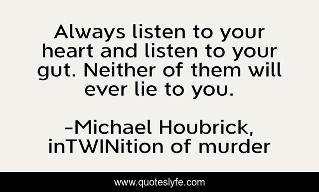 This page presents the quote "Always listen to your heart and listen to your gut. Neither of them will ever lie to you.". Author of this quote is Michael Houbrick, inTWINition of murder. This quote is about mystery, suspense-drama, intrigue,.