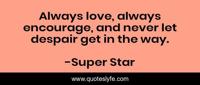 This page presents the quote "Always love, always encourage, and never let despair get in the way.". Author of this quote is Super Star. This quote is about confidence, recovery, positive, motivational, optimistic, inspirational, enthusiasm, addiction,.